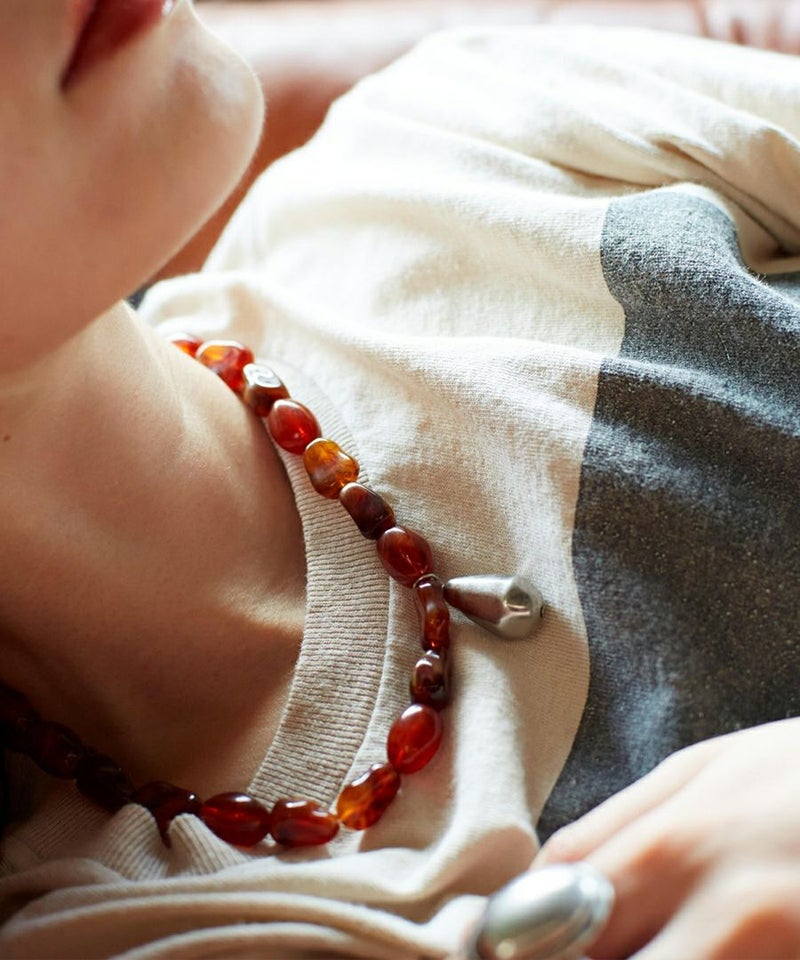 ちょうど襟ぐりの下くらいにくる絶妙な長さで、くたっとしたラフな白いTシャツや、無地のワンピースなどに合わせるのがおすすめです。
