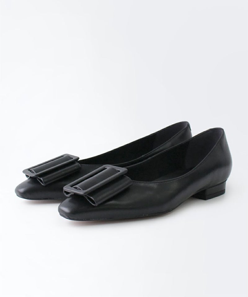 存在感がありながら主張しすぎないワンカラーのバックルデザインで、足元を上品にまとめてくれるフラットシューズ。