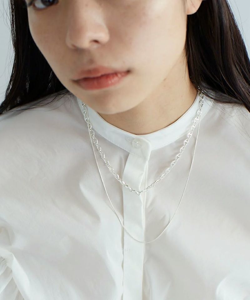 中細サイズのニュアンスパーツを繋いだデザインチェーンと、丸線の華奢なスネイクチェーンを2連にしたネックレス。