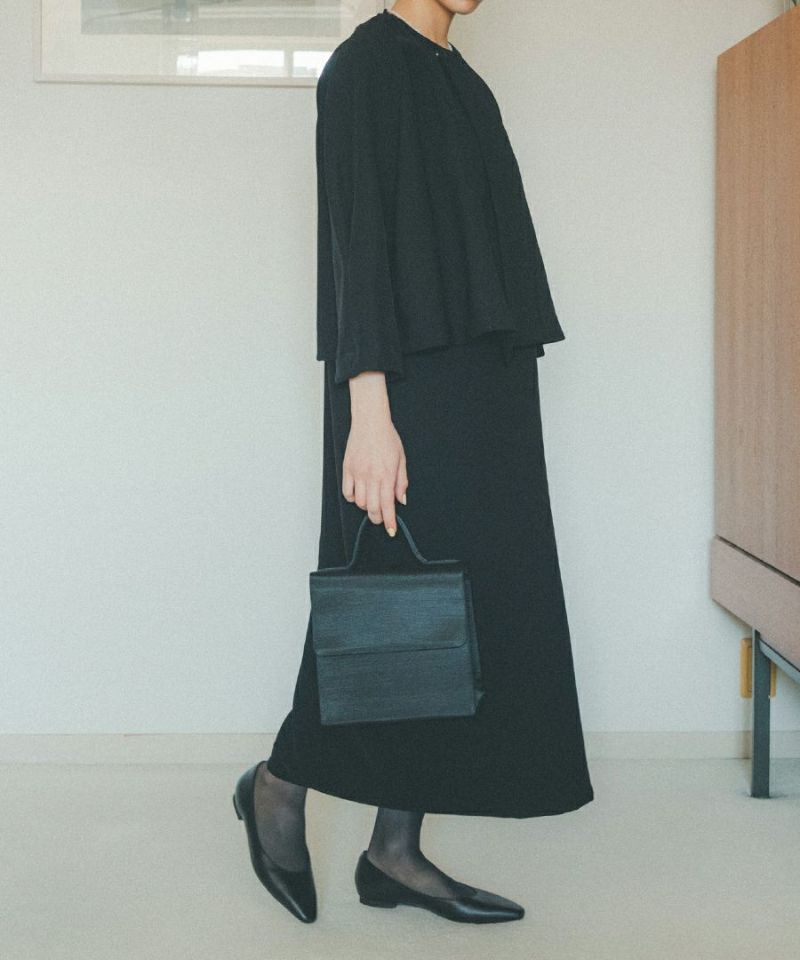 コンサバティブな印象にならないよう、正方形のシルエットに仕上げたブラックフォーマルバッグ。