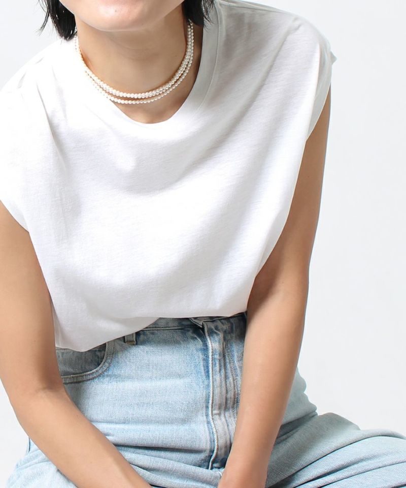 肩先をやや覆うノースリーブと、重ね着もしやすいようよりタイトになったクルーネックがポイント。