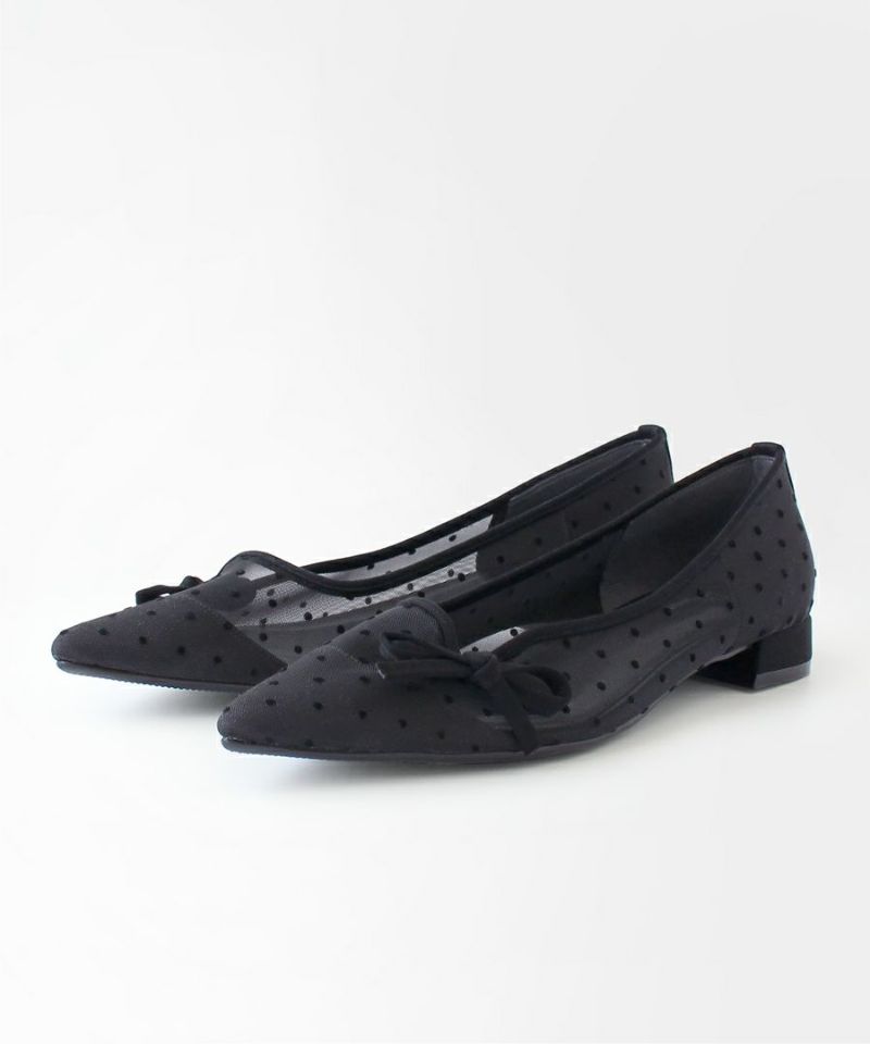 カジュアルコーデやマニッシュコーデにプラスしたい、ドット模様のチュールとパイピングのリボンがチャーミングなパンプス。